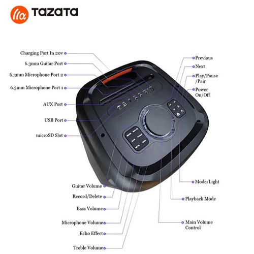 استفاده از اسپیکر تازاتا PARTY FS-L2212 بسیار ساده و راحت است. صفحه نمایش LED آن، اطلاعات مهم را به وضوح نمایش میدهد. روی بدنه اسپیکر، کلیدهای کنترلی متعددی برای دسترسی سریع به امکانات مختلف قرار داده شده است. میتوانید به راحتی موزیک را تغییر دهید، آن را متوقف یا پخش کنید، حالت پخش را عوض کنید، اکو میکروفون را تنظیم کنید و یا اسپیکر را روشن و خاموش کنید. علاوه بر این، کنترلهای صدای مجزا برای میکروفون، گیتار و اسپیکر، امکان تنظیم دقیق و حرفهای صدا را برای شما فراهم میآورد.