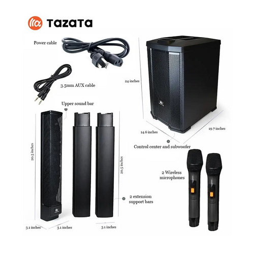 اسپیکر تازاتا PARTY FS-T900 با اقلام همراهی کامل عرضه میشود تا شما بلافاصله بتوانید از آن استفاده کنید. در جعبه این محصول، کابل AC برای اتصال به برق و کابل AUX برای اتصال باسیم به دستگاههای مختلف قرار داده شده است. همچنین، 2 عدد میکروفون بیسیم نیز همراه با اسپیکر ارائه میشود تا شما و دوستانتان بتوانید از قابلیت کارائوکه لذت ببرید. این پکیج کامل، شما را از خرید هرگونه لوازم جانبی اضافی بینیاز میکند.