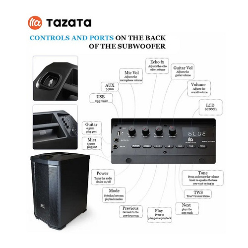 اسپیکر تازاتا PARTY FS-T900 تنها برای گوش دادن به موسیقی نیست. این دستگاه با قابلیت اتصال به گیتار، به شما امکان میدهد تا هنر موسیقی خود را به نمایش بگذارید. همچنین، با استفاده از کلیدهای کنترلی روی اسپیکر، میتوانید به راحتی موزیک را عوض کنید، آن را متوقف یا پخش کنید، اکو میکروفون را تنظیم کنید و یا اسپیکر را روشن و خاموش کنید. کنترلهای صدای مجزا برای میکروفون، گیتار و اسپیکر نیز به شما اجازه میدهند تا به راحتی تنظیمات صدا را شخصیسازی کرده و بهترین خروجی را دریافت کنید.